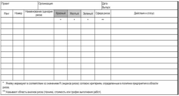 b) План действий должен охватывать все элементы, величина риска которых выше уровня, установленного в политике предприятия в области менеджмента риска проекта. Он необходим для увеличения обозримости информации о риске, возможности быстро принимать решения и обеспечения регулярной отчетности о состоянии риска руководству и всем лицам, связанным с последствиями опасного события.