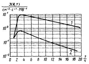 1 - поток протонов с Е = 30 МэВ; 2 - поток протонов с Е = 100 МэВ.