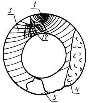 1 - очаг разрушения; 2 - ступеньки и рубцы; 3 - усталостные линии; 4 - зона ускоренного развития трещины; 5 - зона долома
