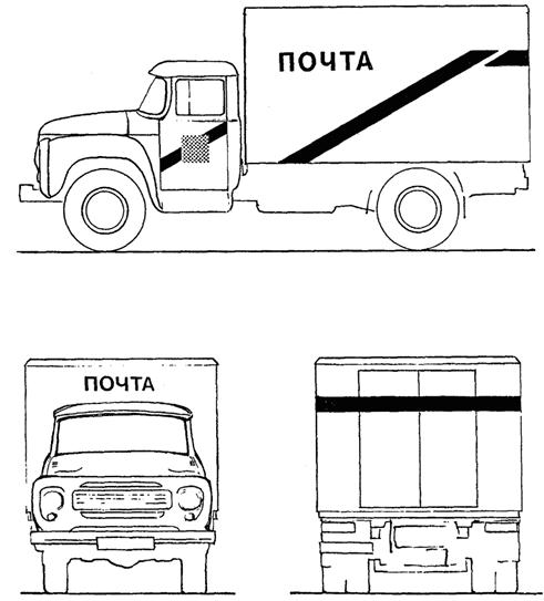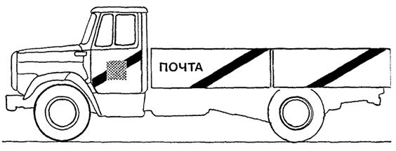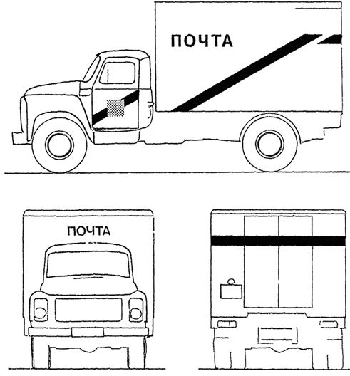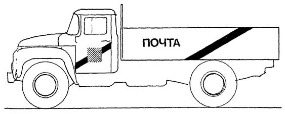 Полосы на поверхностях машин, надпись «ПОЧТА» на поверхностях голубого и светло-синего цвета; решетка радиатора кабин грузовых автомобилей ЗИЛ и ГАЗ |