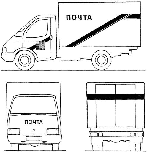 3.1 Цветографические схемы транспортных средств почтовой связи должны соответствовать указанным в приложении А (на рисунках А.1, А.2 приведены цветографические схемы специализированных автомобильных фургонов, на рисунках А.3, А.4 - малотоннажных автомобильных фургонов, на рисунках А.5, А.6 - микроавтобусов, на рисунках А.7 - А.13 - грузовых бортовых автомобилей, на рисунке А.14 - малотоннажных грузовых бортовых автомобилей, на рисунке А.15 - грузопассажирских автомобилей, на рисунке А.16 - малотоннажных грузовых автомобилей, на рисунках А.17 - А.22 легковых автомобилей).