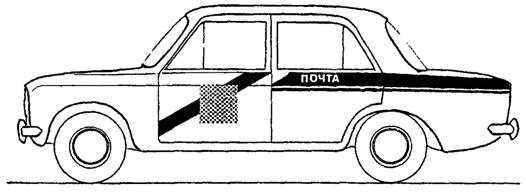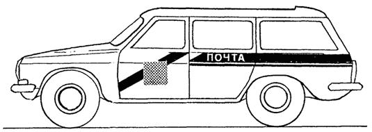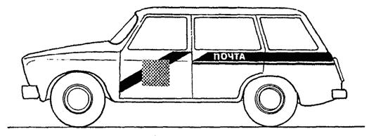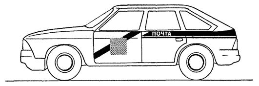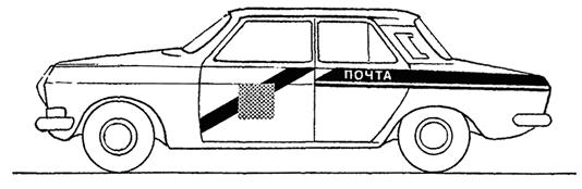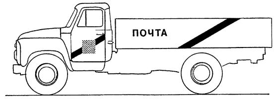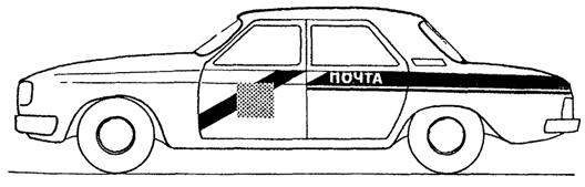 Допускается нанесение графического знака почтовой связи на контрастирующие диагональные полосы покрытий передних дверей автомобилей и микроавтобусов.