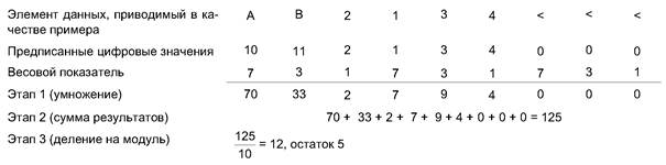 В.1.1 Этап 1. Слева направо умножить каждую цифру соответствующего элемента цифровых данных на весовой показатель, стоящий в соответствующей последовательной позиции.