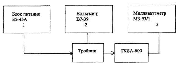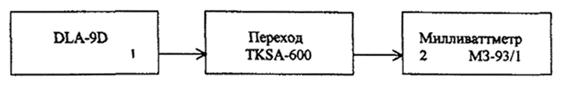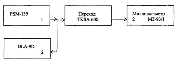 Определение погрешности анализатора DLA-9D при измерении опорного уровня сигнала 0 дБм проводится с помощью генератора PSM-139 и милливаттметра МЗ-93/1 (с переходом TKSA-600) по схеме, изображенной на рисунке 3.