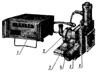1 - оптико-электронный преобразователь с блоком УЦП; 2 - зеркало в оправе; 3 - основание; 4 - микрометрический винт; 5 - неподвижная отрицательная линза; 6 - каретка с подвижной положительной линзой.