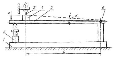 1 - станина; 2 - микрометрический винт; 3 - измерительный наконечник отсчетного устройства (нуль-индикатора); 4 - концевая мера; 5 - измерительная линейка; 6 - ось вращения базовой линейки