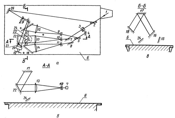 в юстировочных головках закрепляют стеклянный клин 2, куб-призму 3, полупрозрачное зеркало 5, плоские зеркала 4, 7, 8, 15, 16, 18, 22, 24, 26, короткофокусные линзы 9 - 11, 25 и фотообъектив 23 типа «Индустар-23» или «Инду-стар-24»;