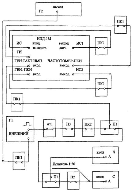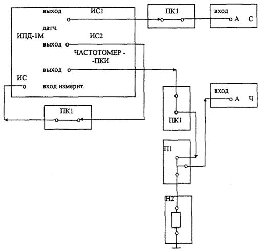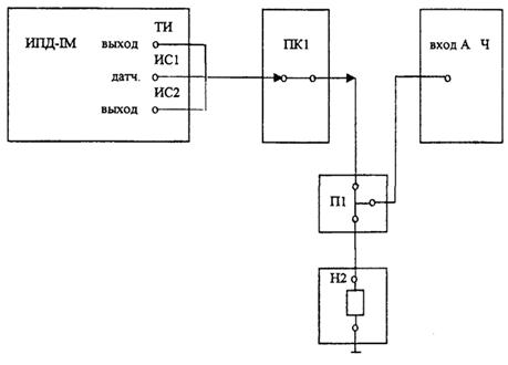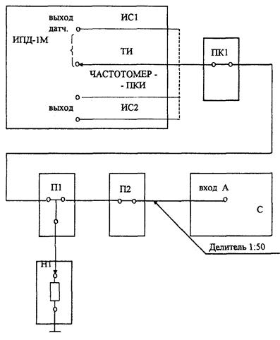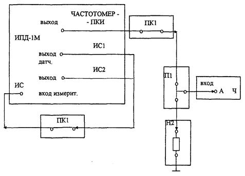 Между выходом «ИС1» датчика и входом ИС измерителя включить кабельную перемычку ПК1. К выходу ЧАСТОТОМЕР - ПКИ с помощью кабельной перемычки ПК1 и тройника П1 подключить нагрузку Н2 и вход А частотомера Ч3-54 в режиме суммирования по А.