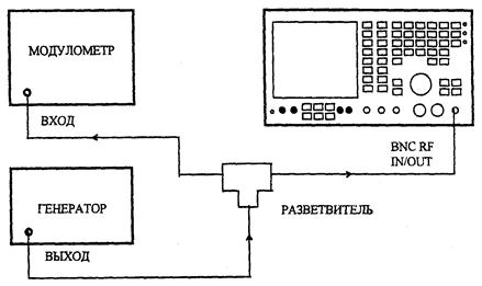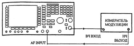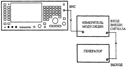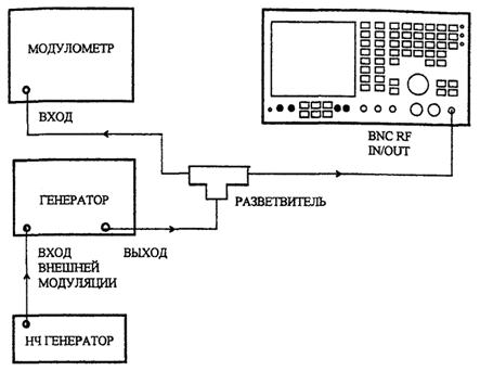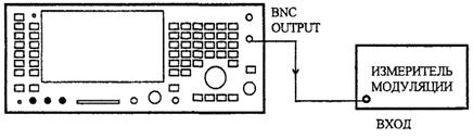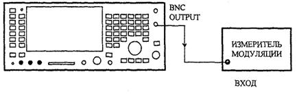 На поверяемом приборе установить режимы RX TEST, RF GEN, MOD GEN, GEN 2, выбрать частоту выходного сигнала 100 МГц при уровне 0 дБм и выход BNC OUTPUT. Установить частоту модулирующего сигнала 1 кГц и глубину модуляции 5 %. С помощью измерителя модуляции убедиться в том, что измеренная величина отличается от установленной не более чем на ±7 % от установленной величины ±1 единица младшего разряда отсчета. Повторить измерения для глубин модуляции 10, 20, 40, 80 и 99 %.