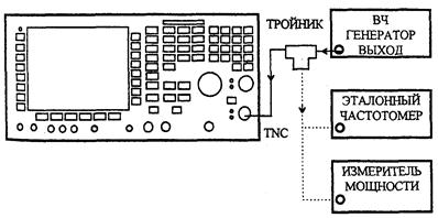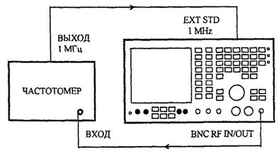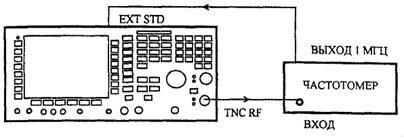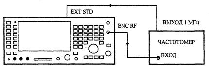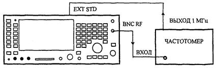 6.7.2.1 Для определения погрешности установки несущей частоты соединить BNC RF выход поверяемого прибора со входом частотомера, имеющего выход опорного сигнала, как показано на рисунке 56.