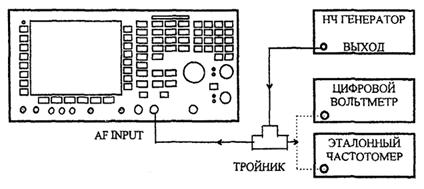6.7.4.1 Для определения погрешности измерения частоты и чувствительности соединить приборы, как показано на рисунке 66. При этом должна быть обеспечена синхронность сигналов опорной частоты поверяемого прибора и НЧ генератора.