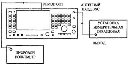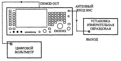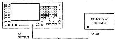 Соединить разъем DEMOD OUT, находящийся на задней панели поверяемого прибора, с цифровым вольтметром. Переключить цифровой вольтметр в режим измерения напряжения переменного тока в полосе частот (0,3 - 3,4) кГц и зафиксировать его отсчет А. На измерительной установке выключить модуляцию и снова зафиксировать отсчет вольтметра В. Вычислить величину остаточной ЧМ, Гц, по формуле