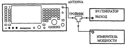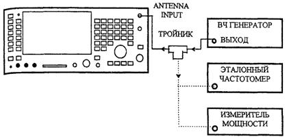 На поверяемом приборе установить режим ТХ TEST и выбрать антенный вход ANTENNA INPUT. Нажать клавиши HELP/SET-UP, SET-UP и установить разрешение частотомера 1 Гц, затем нажать клавишу RETURN, RETURN, чтобы вернуться в режим проверки передатчиков. От ВЧ генератора на поверяемый прибор подать сигнал частотой 10 МГц, которую следует контролировать по эталонному частотомеру, и с уровнем минус 60 дБм. Проверить этот уровень с помощью измерителя мощности. В случае необходимости подрегулировать уровень. Считать отсчет частотомера и убедиться в том, что он отличается от установленной частоты не более чем на ±1 Гц.