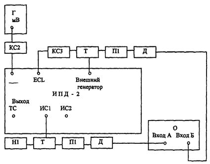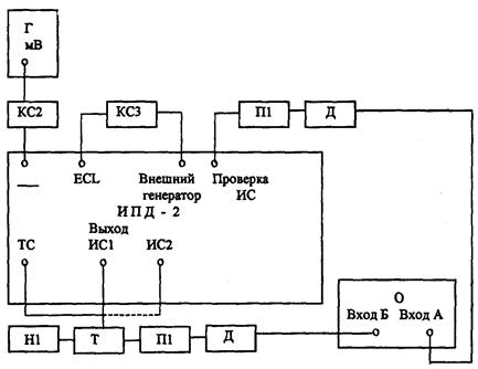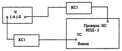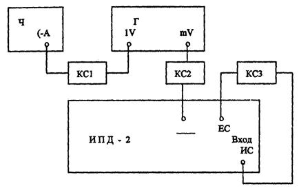 Ч - частотомер Ч3-63; Г - генератор сигналов Г4-102; КС1 - кабель соединительный из комплекта ЗИП Ч3-63; КС2 - кабель соединительный из комплекта ЗИП Г4-102; КС3 - кабель соединительный из комплекта ЗИП ИПД-2 (3г4.850.108-01).