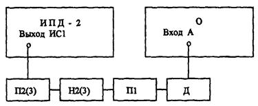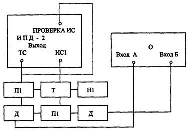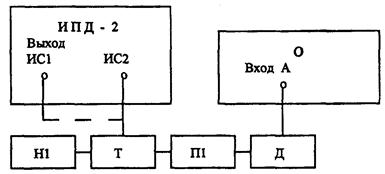 О - осциллограф C1-75; П1 - переход из комплекта ЗИП ИПД-2 (3г5.433.752); Т - тройник из комплекта ЗИП ИПД-2 (ВРО.364.013); Д - делитель 1:50 из комплекта ЗИП С1-75; H1 - нагрузка 75 Ом из комплекта ЗИП ИПД-2 (3г5.435.506).