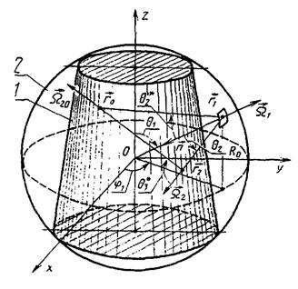 2.1. Геометрию и состав вещества КА задают по ГОСТ 25645.204-83, причем в качестве внешней границы объекта принимают описанную сферу радиуса R0. Начало неподвижной системы координат совмещают с центром сферы (см. рисунок).