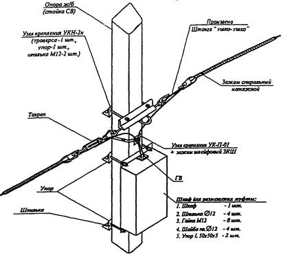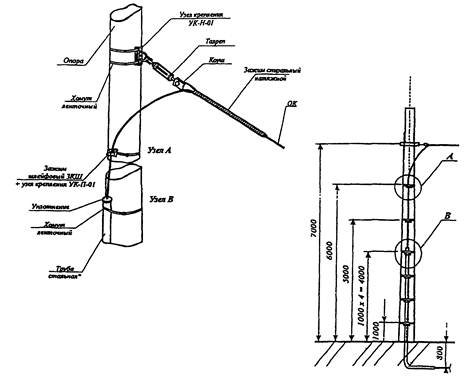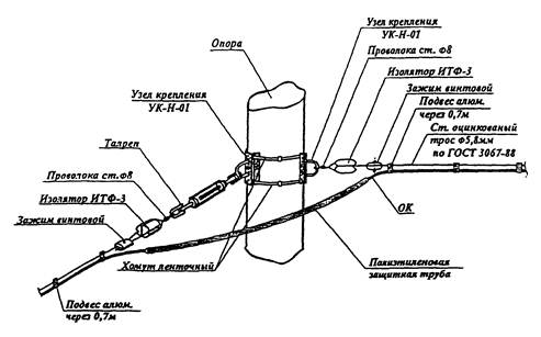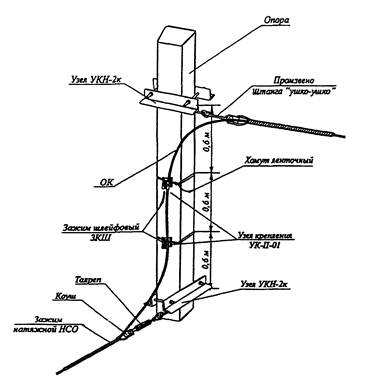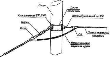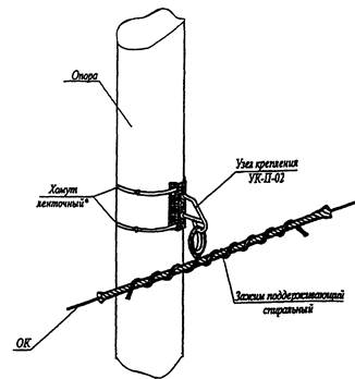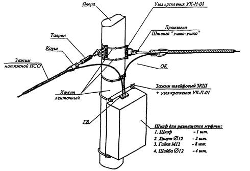- оптических подвесных самонесущих кабелей с повивом из синтетических (арамидных или кевларовых) нитей или с броней из стеклопластиковых прутков, подвешиваемых на опорах связи, ВЛ, контактной сети железных дорог и освещения;
