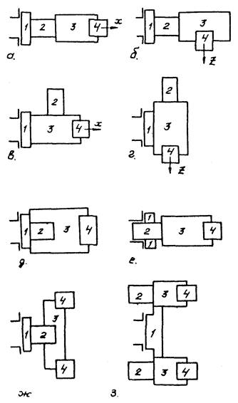 На рис. 1, д, е, ж, з показаны модификации компоновок для базового варианта, приведенного на рис. 1, а.