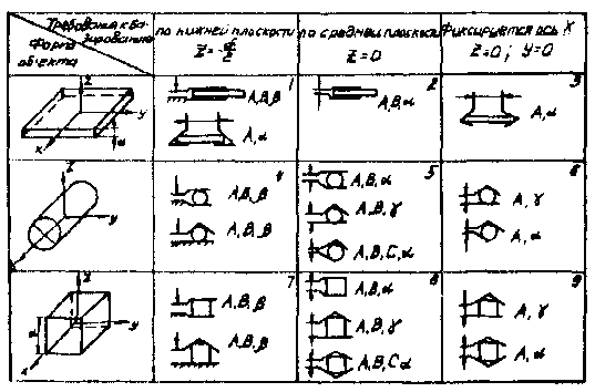 Схемы базирования объекта приводятся с указанием поверхностей объекта, по которым производится захватывание, а также направления подхода схвата на позиции захватывания или отпускания |