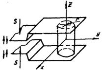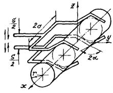 Для всех объектов захватывание производится за цилиндрические поверхности, при этом по двум обобщенным координатам (смещению объекта вдоль оси симметрии цилиндрической поверхности и повороту вокруг этой оси) объект может быть зафиксирован только силами трения; жесткое фиксирование принудительным базированием по остальным четырем координатам, определяющим положение и ориентацию объекта в пространстве, возможно, если обеспечить контакт объекта с рабочими элементами схвата не менее чем в пяти точках. Для более равномерного распределения реакций в точках контакта и снижения их значений при захватывании хрупких объектов выбирается схема базирования с восемью точками контакта, показанная на рис. П5.1. С целью увеличения предельно допустимых значений приложенных моментов вокруг осей X и У точки контакта максимально разнесены по оси Z.