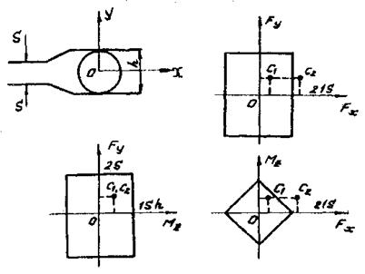 Длина рабочего элемента с по оси X выбирается из следующих ограничений. При захватывании объекта минимального радиуса R0 рабочие элементы не должны упираться друг в друга, то есть должно выполняться неравенство (см. рис. П5.2, а): c £ 2R0 / sina. При захватывании объекта максимального диаметра R1 не должна вступать в контакт с объектом крайняя точка рабочего элемента (см. рис. П5.2, б), т.е. должно выполняться неравенство: c ³ 2R1 / sina. Для выбранных параметров рассматриваемой задачи получаем диапазон возможных значений параметра 30 мм < с < 40 мм. С целью уменьшения габаритов схвата выбираем С = 32 мм.