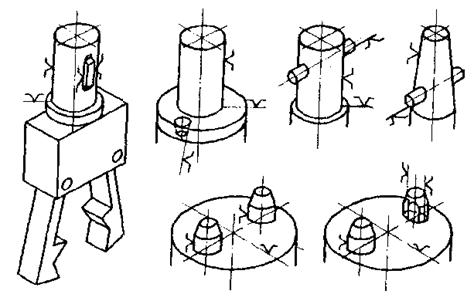 рабочие элементы - обеспечение базирования, жесткого фиксирования предметов по заданным координатам, контакта с предметом по задаваемым точкам, линиям или поверхностям;