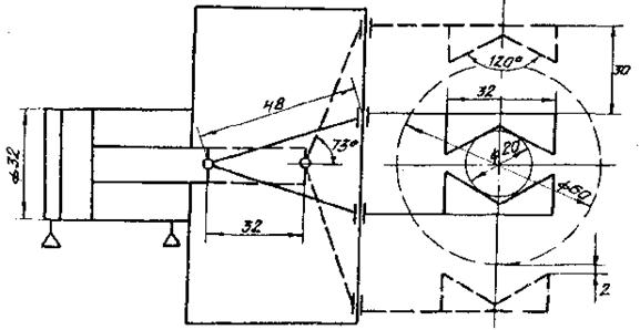 5. Выбор компоновки схвата. Продольная ось соединительного элемента и ось направления подхода схвата к объекту совпадают, ось пневмоцилиндра целесообразно направить в том же направлении, как показано на рис. 1, а, т.е. для базовой компоновки с продольным расположением осей. Механизм передачи обеспечивает перемещение рабочих элементов схвата при захватывании и отпускании в направлении, перпендикулярном направлению подхода схвата к объекту, при поступательном перемещении выходного звена пневмоцилиндра.