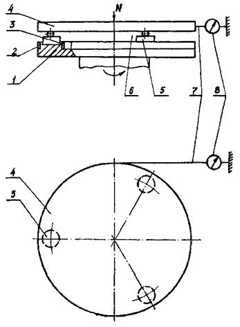 Схема рабочего узла представлена на рис. 3. Вращение получает полый вал 1 червячного колеса, на верхнем торце которого укреплено кольцо 2. К ограниченному съемными буртиками верхнему торцу кольца поджаты три одинаковых цилиндрических образца 3 из контролируемых материалов, равноудаленные друг от друга. Трение осуществляется между торцами образцов 3 и круговой направляющей кольца 2. Нагрузка на образцы передается через нагрузочный винт 4, гайку с ручками 5, упорный шарикоподшипник 6 и нажимной диск 7. Последний винтами 8 через сухари (на рис. 3 не показаны) может поджиматься к дискам резьбовой поверхности винта 4.