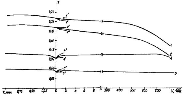 В лабораторных исследованиях можно определять значения коэффициента трения не при ступенчатом изменении скорости, а при непрерывном ее изменении с заданным ускорением. Получаемые статодинамические характеристики трения при положительном ускорении (возрастании скорости от 0 до Vmax) расположены обычно несколько выше (рис. 2, кривые 1' и 2'), а при отрицательном ускорении (уменьшении скорости от Vmax до 0) - обычно несколько ниже1) (рис. 2, кривые 1'' и 2'') кинетической характеристики. Это различие можно рассчитать из предположения, что параметры динамического (при движении с ускорением) трения при мгновенной скорости Vi, которой соответствует момент времени ti, определяются условиями трения в предшествующий отрезок времени Dti и равны параметрам кинетического (при равномерном движении) трения при скорости V, равной средней за период Dti; величина Dti зависит от ускорения.
