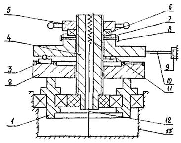 Нажимной диск 7 в горизонтальной плоскости связан с измерительным динамометром 9 тягой 10. На верхнем торце винта 4 укреплен нагрузочный динамометр 11, соединенный со струной 12, проходящей через сквозные осевые отверстия винта 4 и вала 1 и укрепленной нижним концом на неподвижном корпусе 13. Вращением гайки 5 и соответствующим подъемом или опусканием винта 4 создают определенное натяжение струны 12, которое обеспечивает требуемую для испытаний нагрузку на образцы 3.
