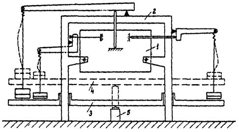 1 - модель; 2 - опорная конструкция с рычагами; 3 - опорная платформа с грузами в нижнем положении (нагрузка действует на модель); 4 - опорная платформа в верхнем положении (нагрузка не действует на модель); 5 - гидравлический или винтовой домкрат.