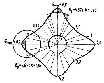 1 - опора напряжений, полученная поляризационно-оптическим методом; 2 - тензорезистор, коэффициент усреднения