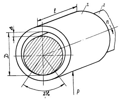 1 - подшипник, 2 - цапфа, D - диаметр, L - длина подшипника, D - диаметральный зазор, Y0 - полуугол контакта, n - частота вращения вала, p - нормальная (радиальная) нагрузка на подшипник