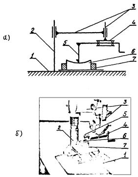 1 - основание прибора, 2 - стойка, 3 - звенья для перемещения резца, 4 - приспособление для закрепления и вращения резца, 5 - резец, 6 - образец (деталь), 7 - устройство для закрепления образца (детали)