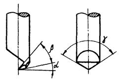 угол заострения резца b = 35 ± 1°; задний угол a = 12 ± 1°; угол в плане γ = 130 ± 1°; отклонение вершины резца от оси оправки не более 0,2 мм