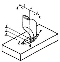 1 - стальной резец, 2 -лунка, 3 - поверхность трения детали (образца), XX - ось вращения резца, EF - длина лунки, OA - радиус вращения вершины резца