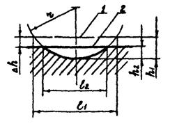 1, 2 - поверхность трения до и после изнашивания соответственно, l1, l2 - длина лунки до и после изнашивания соответственно, h1, h2 - глубина лунки до и после изнашивания соответственно, Dh - линейный износ, r - радиус вращения вершины резца