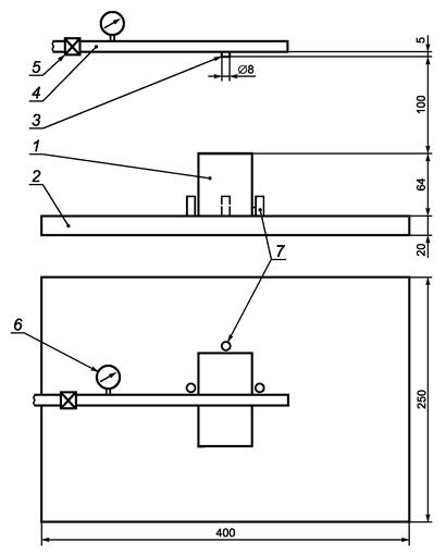 1 - образец; 2 - плита; 3 - сопло; 4 - трубопровод сжатого воздуха; 5 - вентиль; 6 - манометр; 7 - установочные штифты