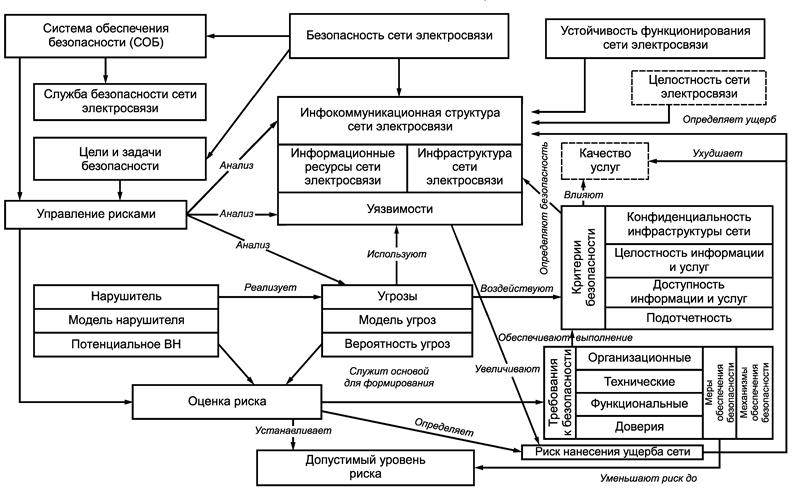 Требования по обеспечению безопасности конкретной сети электросвязи должны формироваться с учетом целей, функций и задач решаемых оператором связи, условий использования сети электросвязи в общей системе связи государства, специфики используемой технологии передачи информации, потенциальных угроз безопасности и возможных ВН, реальных проектных и эксплуатационных ресурсов и существующих ограничений на функционирование сети электросвязи, а также требований и условий взаимодействия с другими сетями электросвязи.