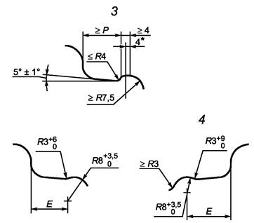 1 - ось вентильного отверстия; 2 - радиус кромки бортовой закраины, равный половине минимального радиуса R; 3, 4 - профили посадочных полок