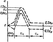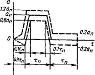 Если осциллограмму импульса ударного ускорения можно заключить между пунктирными линиями, соответствующими допуску на пилообразный импульс (см. рис. 1), то форму импульса ударного ускорения следует классифицировать как пилообразную (или треугольную).