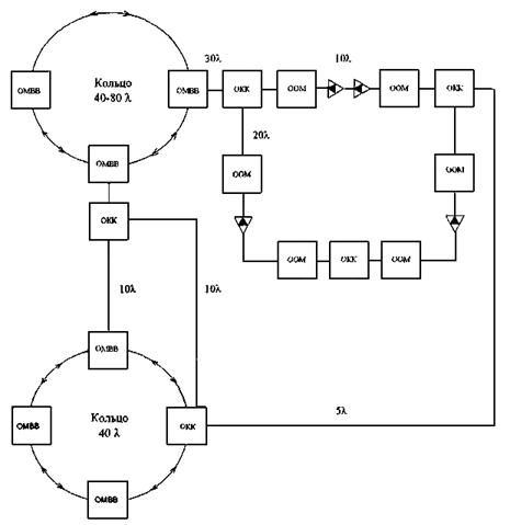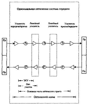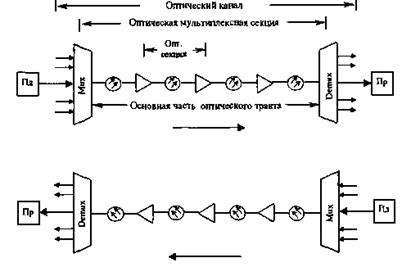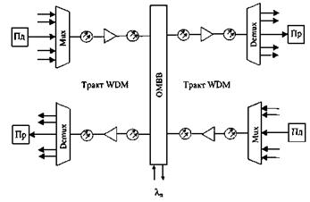 Основная часть оптического тракта системы передачи WDM (Main optical path) - оптическое волокно с оптическими усилителями между выходом оптического мультиплексора на передаче и входом оптического демультиплексора на приеме.