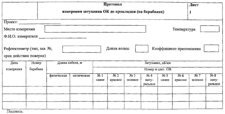 Е.1 Форма протокола измерения затухания ОК до прокладки (на барабанах)