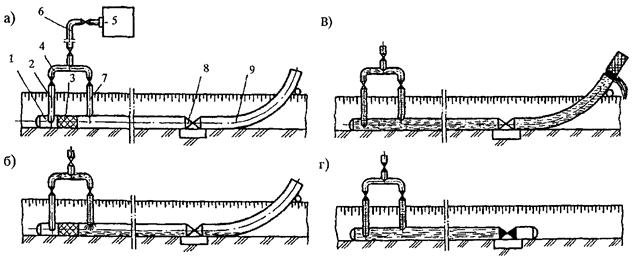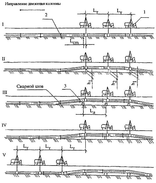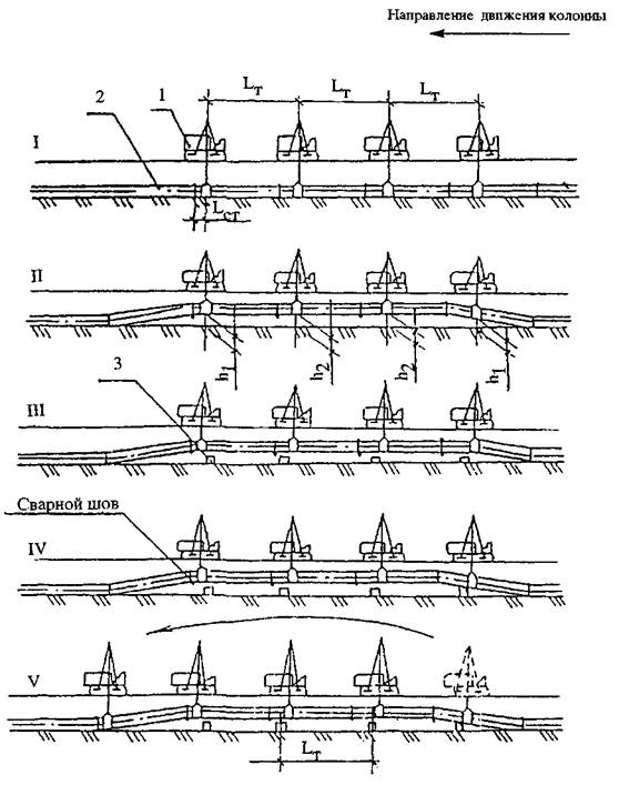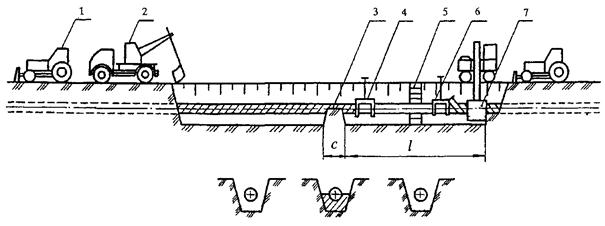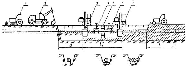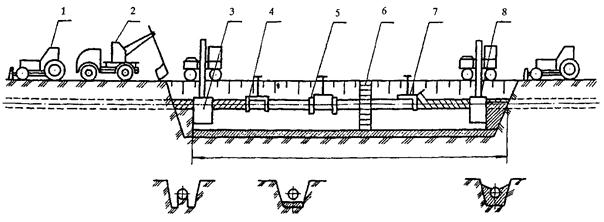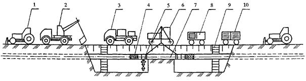 1 - бульдозер; 2 - экскаватор; 3 - ПНА-2; 4 - глиняные пробки; 5 - задвижка; 6 - кран-трубоукладчик; 7 - катушка; 8 - электростанция; 9 - лестница; 10 - сварочный агрегат.