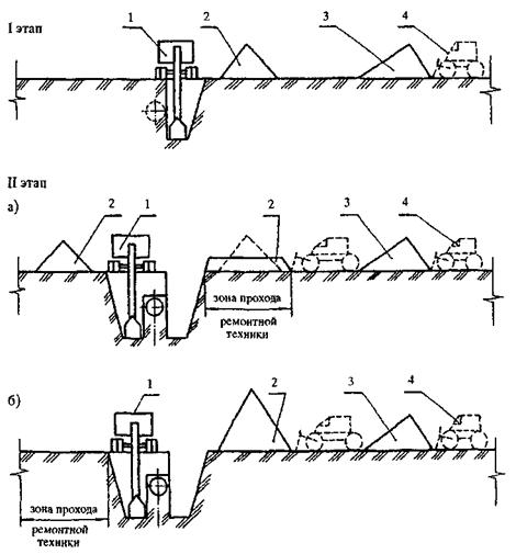 2.2.1 Технологические операции при ремонте с заменой труб путем укладки в совмещенную траншею вновь прокладываемого трубопровода рядом с заменяемым с последующим демонтажом последнего выполняются в два этапа.