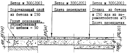 Примечания: 1. Размеры и марки бетона, указанные в скобках, относятся к полам при слабом механическом воздействии на них.