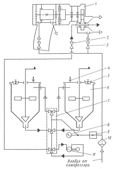 1 - аппарат-распылитель; 2 - кран для подачи мастичного состава; 3 - кран для подачи сжатого воздуха; 4 - предохранительный клапан; 5 - люк для заливки мастичного состава; 6 - загрузочное устройство; 7 - распределитель; 8 - манометр; 9 - регулятор давления; 10 - воздухоочиститель; 11 - насос для промывки