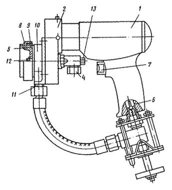 1 - привод; 2 - распылитель; 3 - кран дли сжатого воздуха; 4 - подвод мастичного состава; 5 - насадка; 6 - пусковой клапан; 7 - курок; 8 - крышка; 9 - гайка; 10 - планшайба; 11 - штуцер; 12 - сопло; 13 - пробка