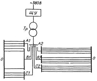 Рис. 1. Схема установки электрообогреваемого пола с нагревателями из стальной неизолированной проволоки на пониженном напряжении