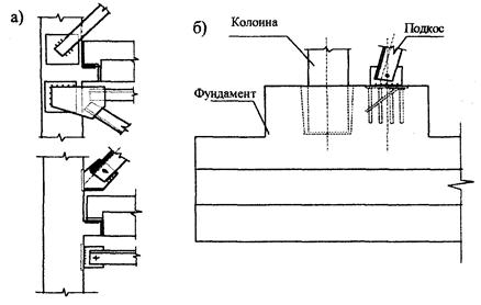 Рис. 12. Конструкция сопряжений металлических связей с колоннами (а) и фундаментом (б)